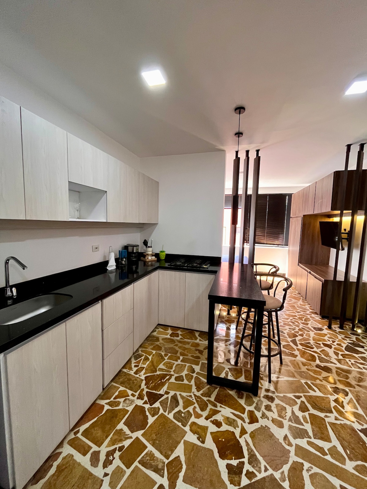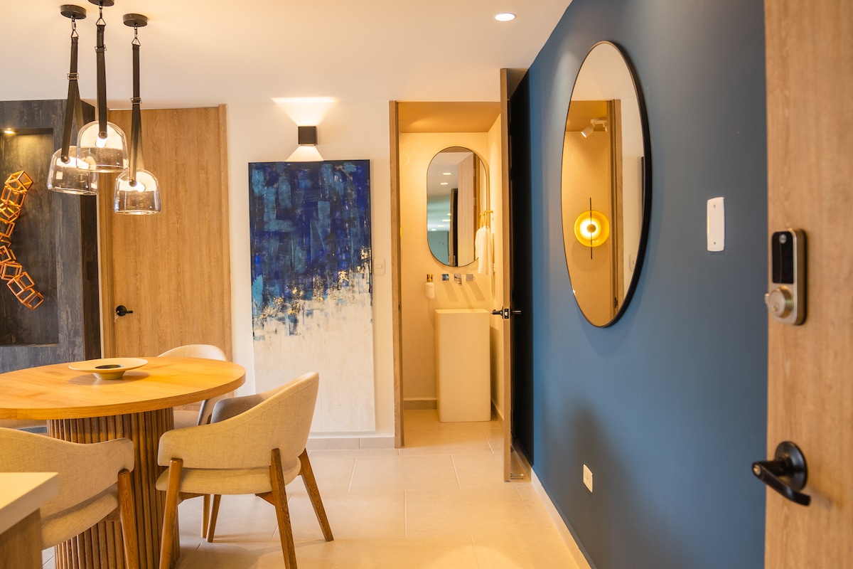 Disfruta de una experiencia con estilo en este alojamiento céntrico, moderno y lujoso, regálate a ti mismo una cálida y acogedora estadía en un espacio diseñado para quienes lo merecen en el mejor lugar de la ciudad. Sala con sofá cama y baño social, área de trabajo, wifi, comedor, cocina, zona de ropa, habitación principal con baño Además de tu confort estarás cerca a supermercados, centros comerciales, restaurantes, parques, droguerías, bares, cafés, transporte público y cable aéreo.
