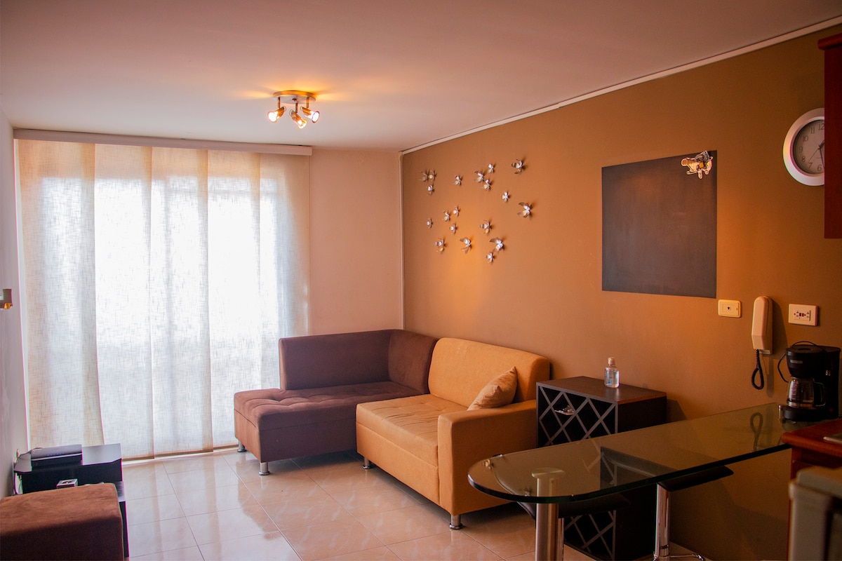 Apartamento en Pinares de Cataluña: - Todos los servicios incluidos (agua, luz, gas, WiFi, TV). - Parqueadero cubierto (cabe camioneta). - Totalmente amoblado. - 1 habitación con cama King Size. - Sofá amplio y zona de trabajo. - 1 baño completo (con agua caliente si se quiere). - Cocina con todo lo necesario. - Lavadora y todo lo necesario para baño y alcobas. - Juegos de cama y de toallas. - Ubicación: mejor sector de Pereira, Pinares Es tranquilo, muy central, zona segura y vigilancia 24h.