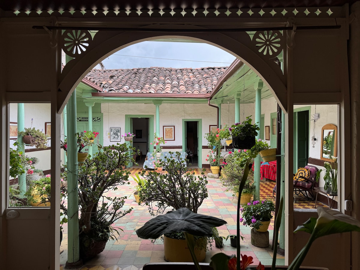 Gran casa tradicional con 500 m2 de comodidad y arquitectura de la colonización antioqueña. A dos cuadras del parque principal pero con vista a la montaña, Jacuzzi, gran patio florecido, patio central empedrado, habitaciones espaciosas con baño privado, sala, comedor y terraza .