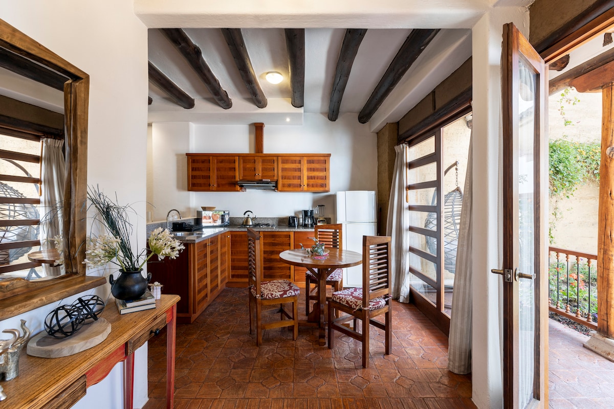 Absorb the warmth and light of open-plan living, with luxurious 9-foot bedroom ceilings, a 20-foot vaulted ceiling with skylight in the common/kitchen area, and oversized windows throughout for a peaceful, quiet, and relaxing stay in Cuenca. ⚡️ 24/7 hot water, Wi-Fi, and electricity for your devices thanks to our grid-tied backup battery system. Note: some high-power appliances like the blow-drier and water kettle do not work during power outages.
