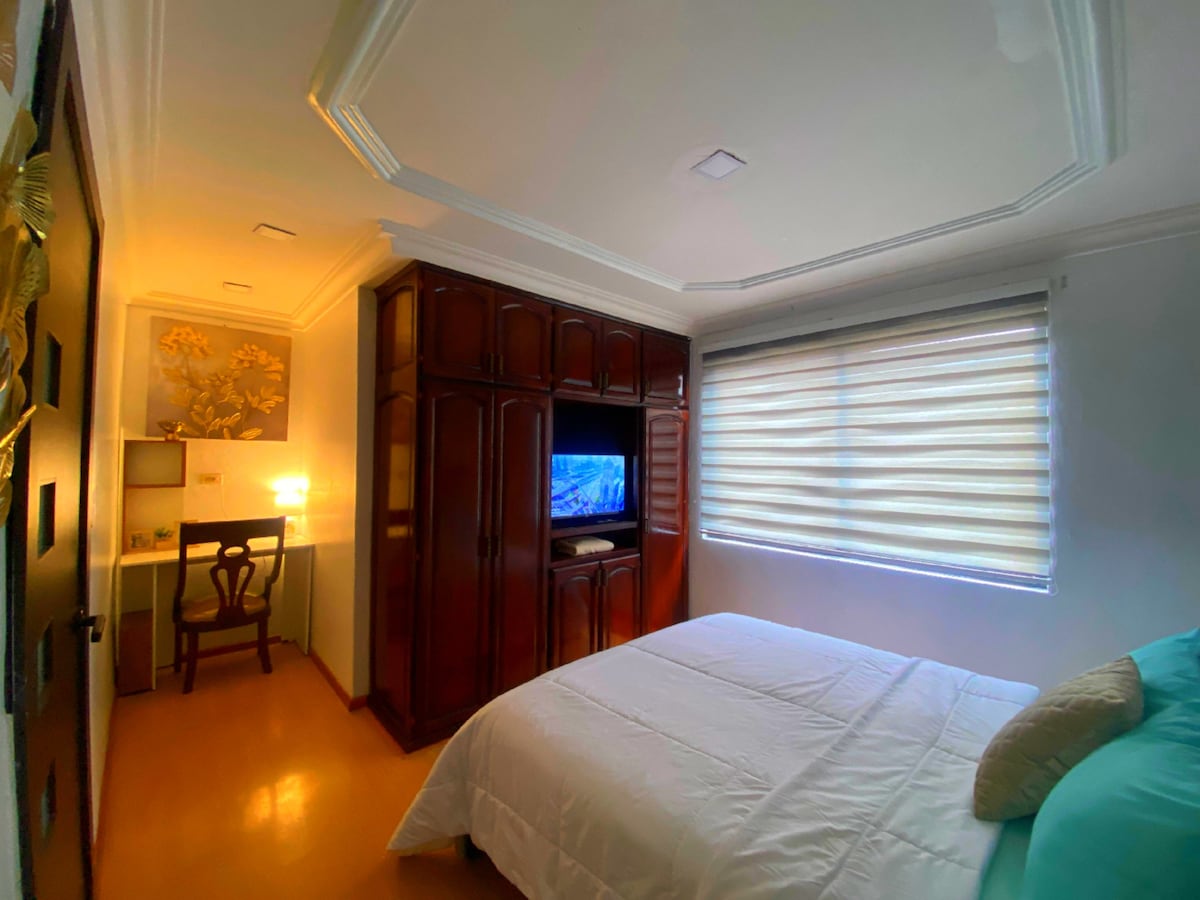 Suite 100% independiente. 1 dormitorio Baño completo. Cocina completa. Área de comedor y sala. Espacio para trabajar remoto. 1 Parqueadero (carro pequeño). Disfruta de la sencillez de este alojamiento tranquilo y céntrico.