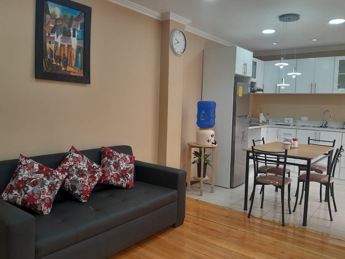 Enjoy a stylish, fully equipped space just 5 minutes from the historic downtown, Mount Sinai Hospital, and the beautiful Parque de la Madre. It's entirely amenity equipped—High-speed Wi-Fi (240 Mb), perfect for working remotely. Garage & elevator. It's just 5-min walk from downtown,Mother's Park, Alejandro Serrano Stadium, Monte Sinai, Supermaxi, banks, etc. Prepare to be captivated by stunning vistas of Cuenca's majestic mountains from the master bedroom. NO SUITABLE FOR CHILDREN or PETS.