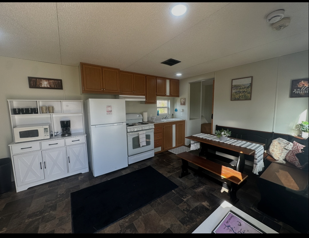 Converted Barn With Vintage Charm And A Modern Twist. This is a Texas Ranch themed unit with a fully furnished kitchen, 2 bedrooms and 1 full bathroom. Bedroom 1 is a private queen suite and bedroom 2 has queen size bunk beds. There is also a pull-out sofa in the living room for additional guests. Private entrance with patio, grill, and picnic table seating for guests in the great outdoors .