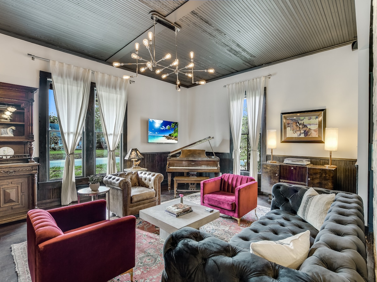 This listing is for the entire venue. Historic 1880's Modern Texas Farmhouse restored w/care & historic charm.The Full Venue includes 4 large bedrooms w/ king beds, ensuite bathrooms. 5th Bedroom is The Shed w/Queen bed, shares a bathroom with the Christopher Suite. Outdoor Shower. Large private yard, deck, patio, pool , porches, hammocks & plenty of space to relax. Fire pit. 4 blocks to walk to square, BBQ joints, music, vintage stores, bars, wine shop, art gallery, restaurants, & coffee shop.