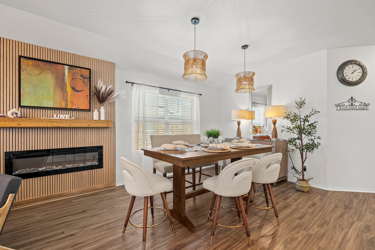 🌵 Welcome to Casa Oasis: Texas Cozy Boho Retreat A stylish single-level home in San Marcos blending Texas charm with modern boho comfort. Enjoy an open living area with fireplace and foosball, a fully equipped kitchen, and four unique bedrooms including a movie room and spacious master suite. Perfect for families, corporate stays, and long-term guests, with high-speed WiFi, Roku TVs, and a peaceful community location near top employers and attractions, EV charger in the garage (included).