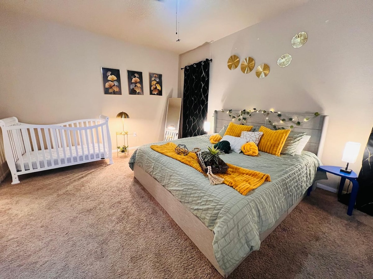 台球桌、桌上足球、加大双人床、婴儿床、停车位和院子