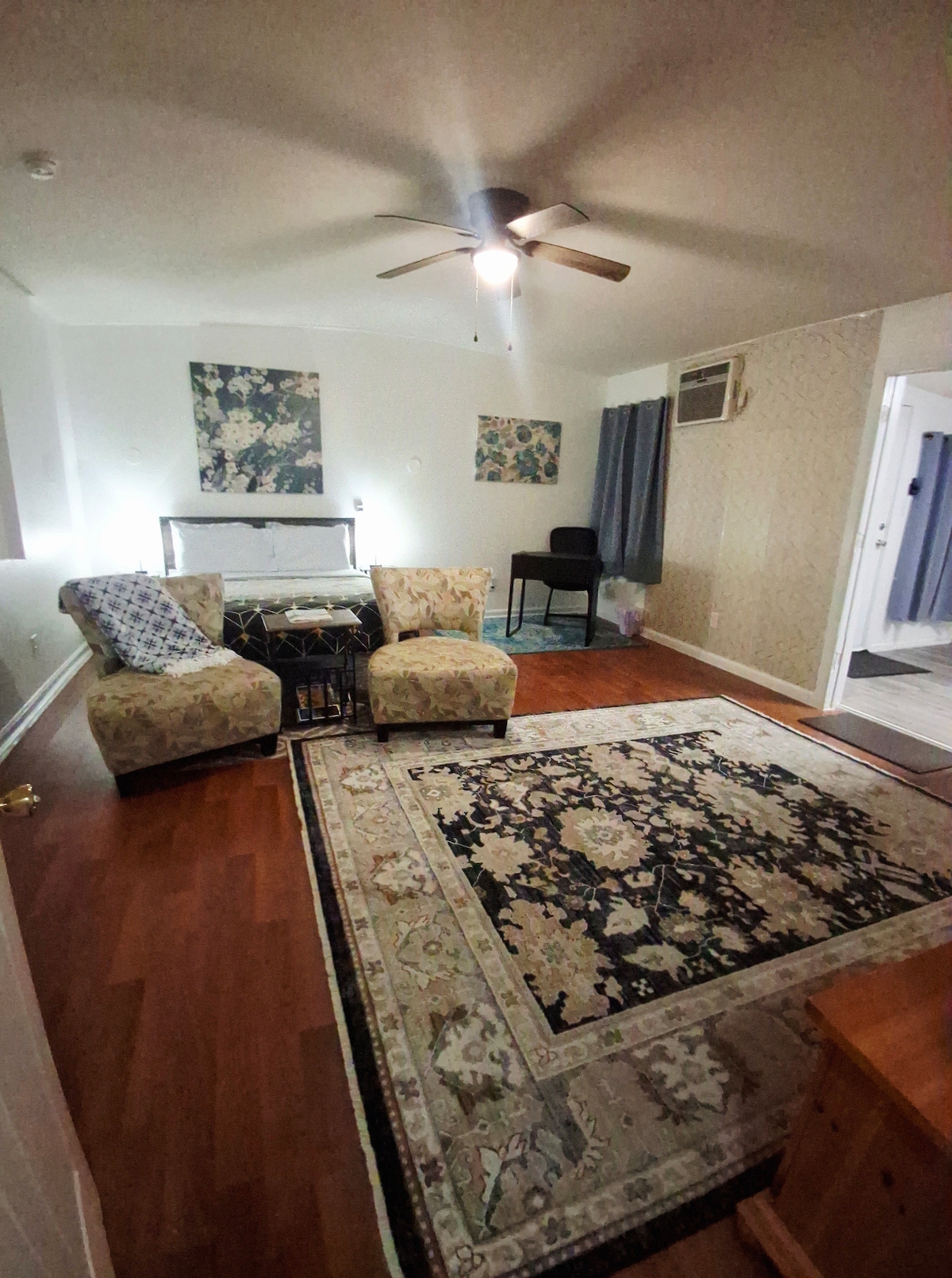 The Christopher Suite is charming attached one bedroom apartment to The Ellison House. It can be rented separately for 2 guests. It has its own private entrance with a porch and back door to the deck and back yard. The only shared space is the deck, patio, back yard and pool , if The Main Ellison House is rented. It has a separate living room and a kitchenette with a sink, mini retro fridge, coffee maker, microwave and toaster. Separate bedroom with king bed, desk, 2 chairs and luxury linens.
