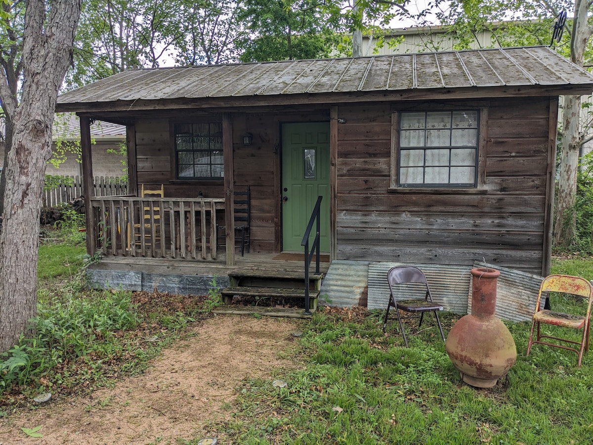 This is a tiny cabin (about 200 sq ft) located in the heart of downtown Lockhart, TX. It is situated in our backyard within walking distance to BBQ, antiques, fine dining and local shopping. It is ideal for a single person or couple. It is very small but cute and well-organized.