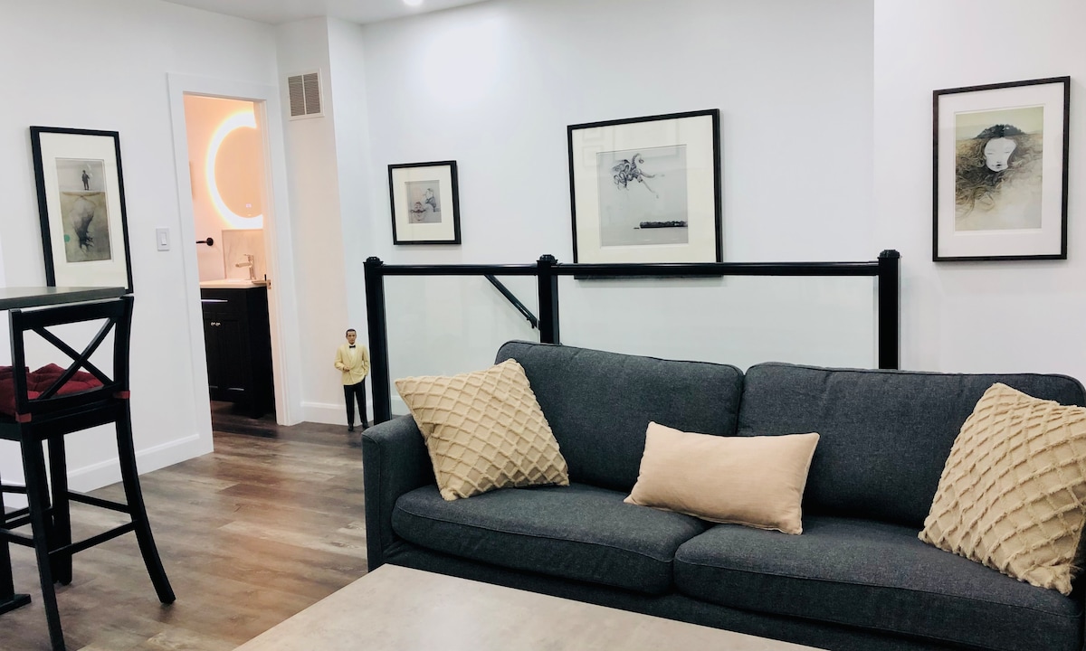 The Gallery Suite near Locke St. and McMaster is ideal for business or leisure stays. This bright, open-concept suite with a separate bedroom features unique artwork by Guelph artist Ryan Price. Located above a quiet RMT clinic, you'll enjoy a peaceful and private stay. Walking distance to trendy shops and cafes. Free parking is included for your convenience. Book now to experience a blend of comfort, art, and convenience!