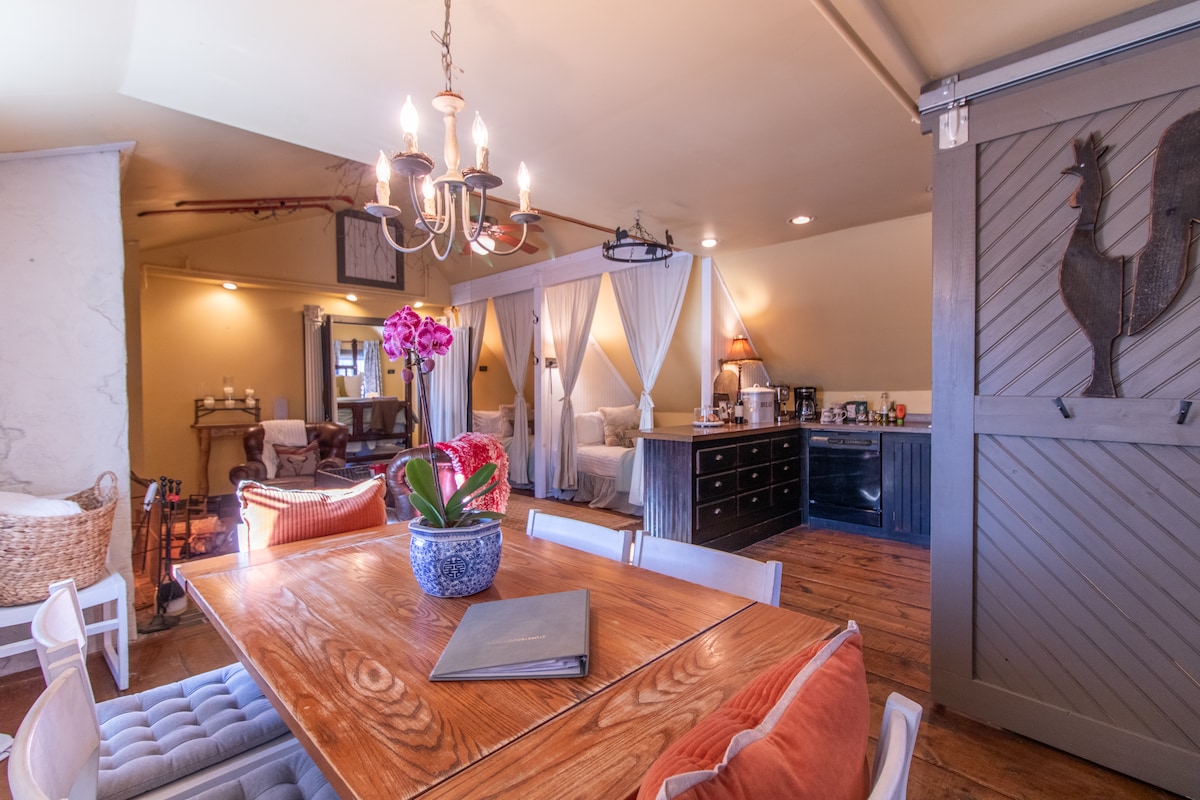 Immerse yourself in the quintessential Vermont experience at Storeybrook Farm. This rescue horse sanctuary is located amidst rolling hills, mountain vistas and a tranquil pond. "The Carriage House” is our largest suite with a fully equipped kitchen (stocked upon request), that opens up to a dining area with forest views. The living room features a woodburning fireplace and 2 built in queen bed "bunks". Enjoy sun-soaked pasture views from the main bedroom or while soaking in the clawfoot bathtub.