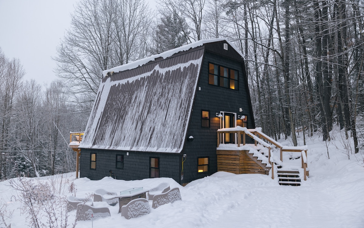 Escape to a modern A-Frame with a hot tub, mountain views, and direct snowmobile trail access. Set on 68 private acres and just 30 minutes to Cannon and Loon, this cabin is perfect for ski trips, sled weekends, and year-round getaways. Enjoy a fully renovated interior, fast WiFi, smart TV, a well-equipped kitchen, EV charger, gas fire pit, wood stove, and private hiking trails. Three comfortable bedrooms and three full bathrooms offer space and privacy for families, couples, and adventurers.