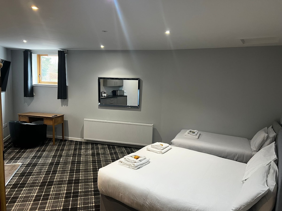 Upstairs warm room with comfy kingsize bed, ensuite with shower. This room also has a single bed which can be made up if requested. Included is coffee, tea etc, & a porridge-pot/cereals/fruit/toast breakfast. The Bar & Restaurant in the hotel (different organisation) open Wed-Sun, meals best booked direct by phone, we can pass their number to you once you have made your Airbnb booking. For Mon-Tue evening meals we provide Oakhouse Foods Frozen complete meals.