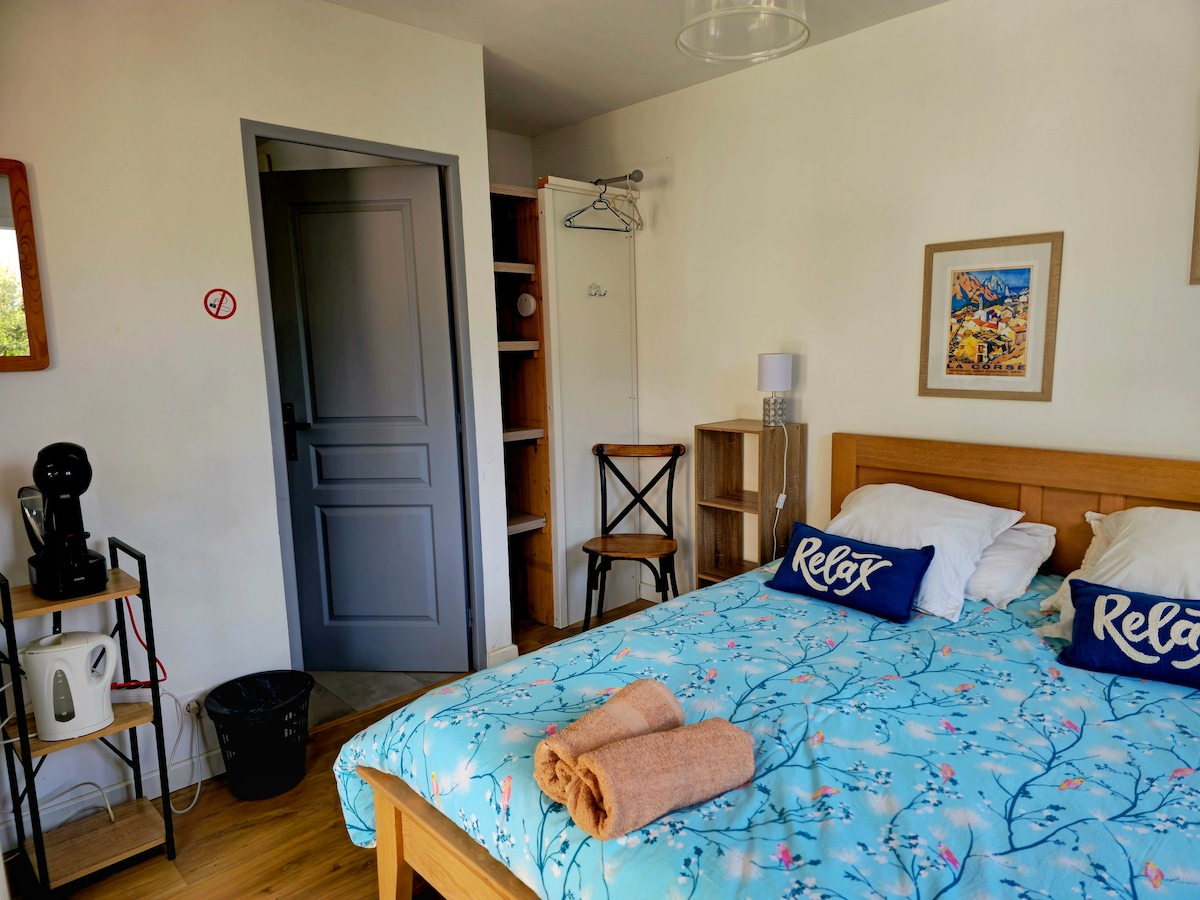 PETIT DEJEUNER COMPRIS/:70€ la nuit et la chambre 2 personnes. 1 chambre lit double dans ma maison familiale. Salle de bain privée. entrée privée.WC privé. Petit dejeuner compris Possibilités de partager de bons moments... 5mn du GR20 Petit dejeuner : 7 à 10h : AVANT 7H : Libre service ACCEUIL CHALEUREUX mais uniquement au DEPART du GR20, car au retours possibilités de punaises de lit(désolée). Chez l'habitant