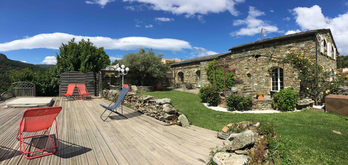 Au coeur de la vallée du Reginu le gîte est entouré de petites rivières accessibles à pied à 800 mètres ! Un havre de paix dans le domaine du Moulin du Frascacciu vieux de 400 ans. En période de production vous pourrez vous initier aux joies de l'oleiculture ! Ici C'est le paradis des animaux qui se partagent une place sans vous déranger. Cheval, chien, chat et poulettes vous attendent dans leur champs. Le jacuzi fera le bonheur des petits et des grands toute l'année même l'hiver !!Aller go>