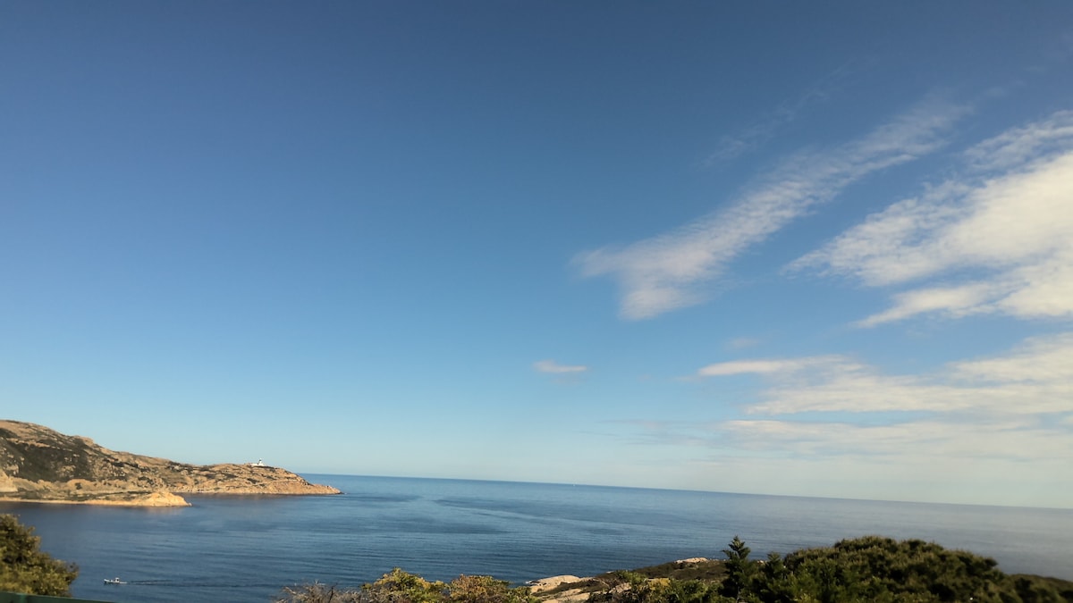 Notre logement offre une magnifique vue sur la montagne. Vous partagerez avec nous une piscine de 6X3M. La plage est accessible à pieds. Totalement rénové par nos soins, avec une décoration unique et raffinée. Vous disposez de 2 lits individuels dans la chambre et d’un divan lit 140X190 dans le séjour. La terrasse est équipée de fauteuils, table, chaises, barbecue. Isolés dans un immense jardin vous y serez au calme absolu. Vos enfants et animaux pourront y circuler en toute sécurité