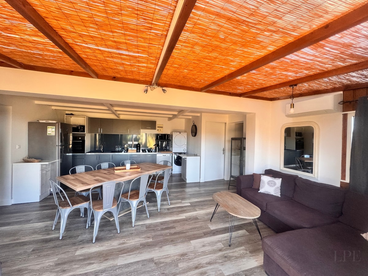 Appartement récent et spacieux sur un terrain de 2 hectares, vous disposerez: D'une cuisine entièrement aménagée ouverte sur une jolie pièce à vivre Une chambre et dressing attenant Une salle de bain avec baignoire d'angle, douche à l'italienne et WC. Une grande terrasse vue montagnes et couché de soleil L'appartement est climatisé et équipé d'une TV, de la connexion WIFI.