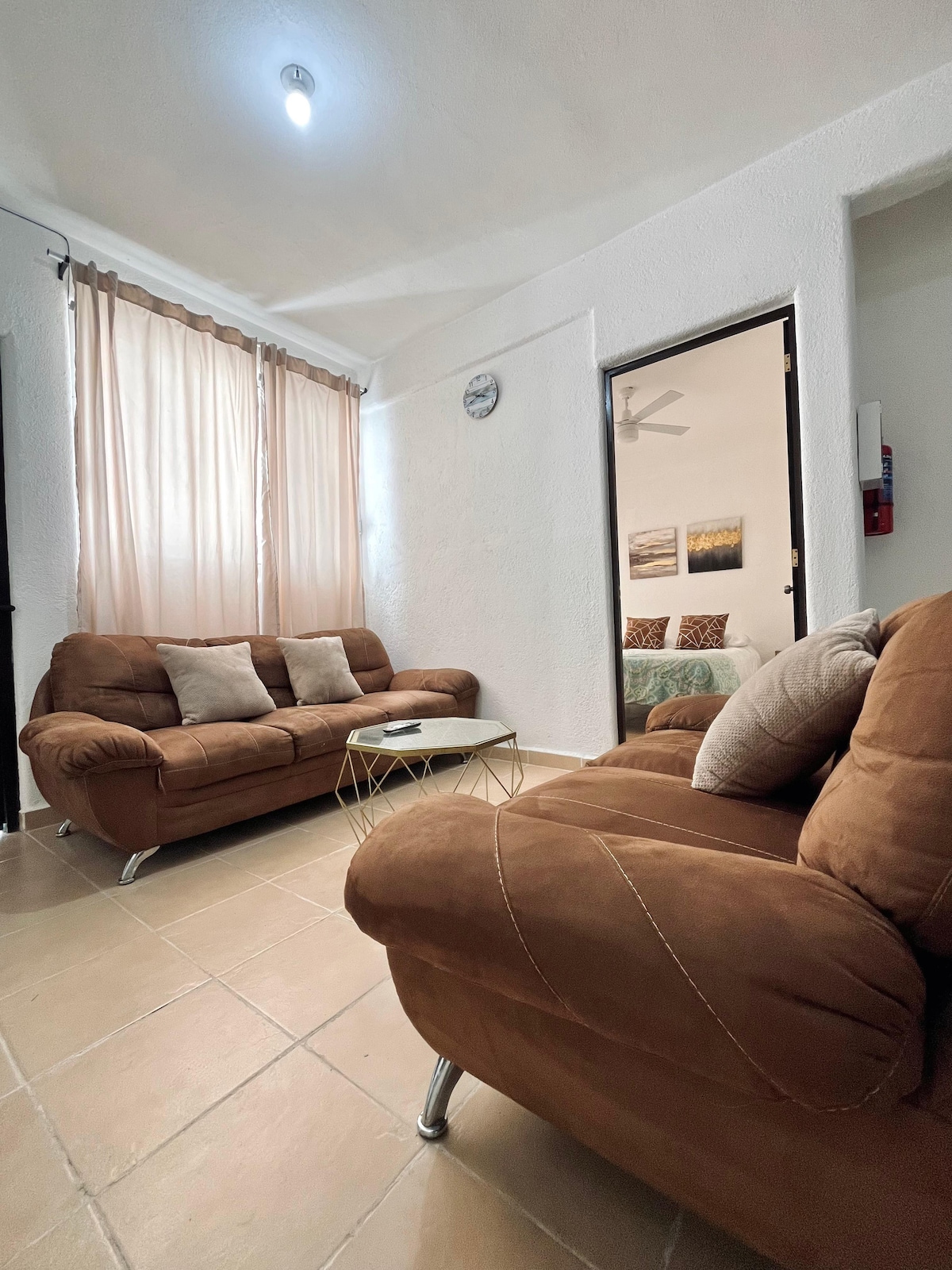 Departamento pequeño para familia pequeña con cama matrimonial, y sofas en sala, cocina y, sofas hasta para dos personas más. Vista al mar Está a un nivel aproximado de un 3er. piso, se suben varios escalones, es recomendable tener buena condición A 5 minutos de playas caletilla y caleta, muy cerca de sinfonía del mar, la quebrada y la isla roqueta. Diversas rutas de transporte público Escritorio,silla, Internet, tv Servicio de lavandería con pago extra