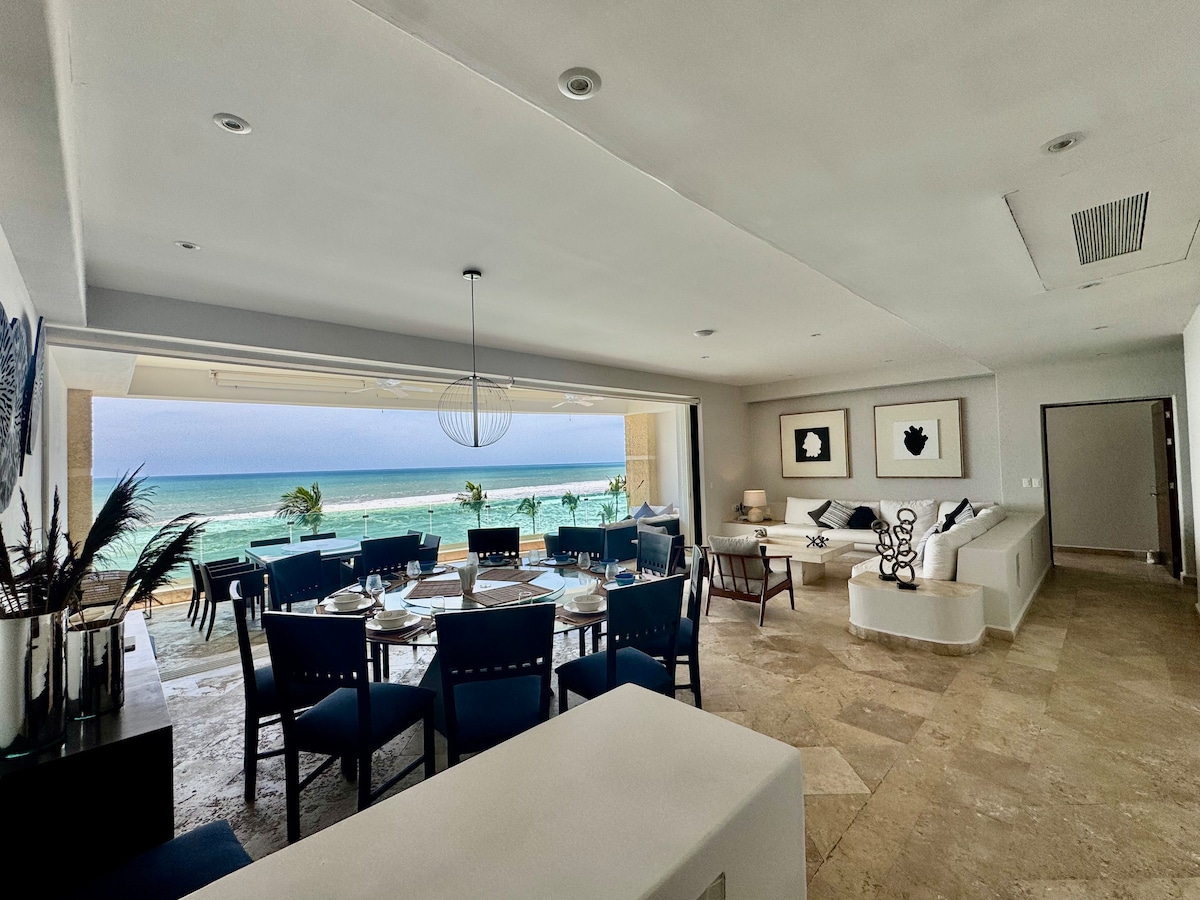 Lujoso, moderno y amplio departamento al pie del mar con vista espectacular de la bahía. El condominio tiene acceso directo a la playa, una zona de alberca con jardin, wifi gratuito en áreas comunes, sundeck y playa privada ! Ambiente relajado y familiar, seguridad las 24h y un personal muy amable y eficiente. Excelente ubicación, a un paso del club de golf, muchas opciones de restaurantes y supermercado cercanos. No se aceptan mascotas.
