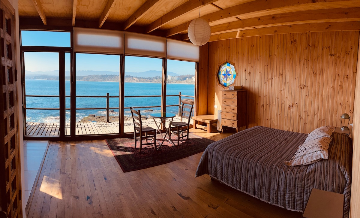 Cabaña con vista al mar y bajada privada a la playa el Clarón, ubicada en Caleta de Horcón, Puchuncavi, Chile. Tenemos una vista inigualable, lo que implica descender por un cerro para llegar a la cabaña ( hay escalera).Puedes ir caminando por la playa a la caleta de pescadores, puente de los deseos, feria artesanal. Puedes hacer teletrabajo y calentarte con estufa a leña Disfruta del sonido del mar de dia y de noche, y de la vista al mar en primera línea