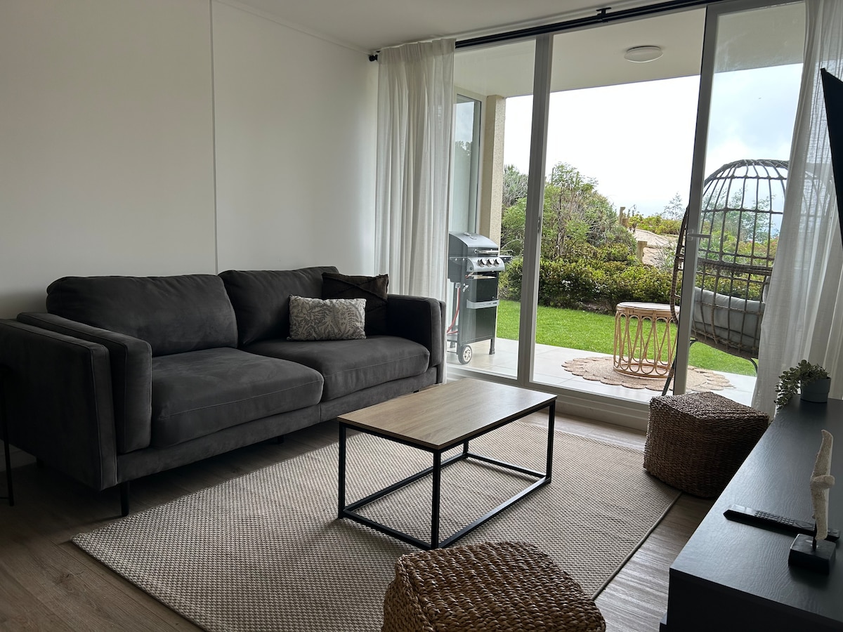 Cálido departamento en PRIMERA LINEA FRENTE AL MAR, con todo lo necesario para un relajo de fin de semana! Solo debes traer tu ropa y disfrutar de los hermosos paisajes al aire libre, bosque, playa, piscina, cancha de tenis, etc. Información importante: - El departamento cuenta con 1 cama super king. - Incluye sábanas (no toallas) - No se admiten mascotas. - No se admiten fiestas. - Acceso a la playa disponible desde fines de diciembre.