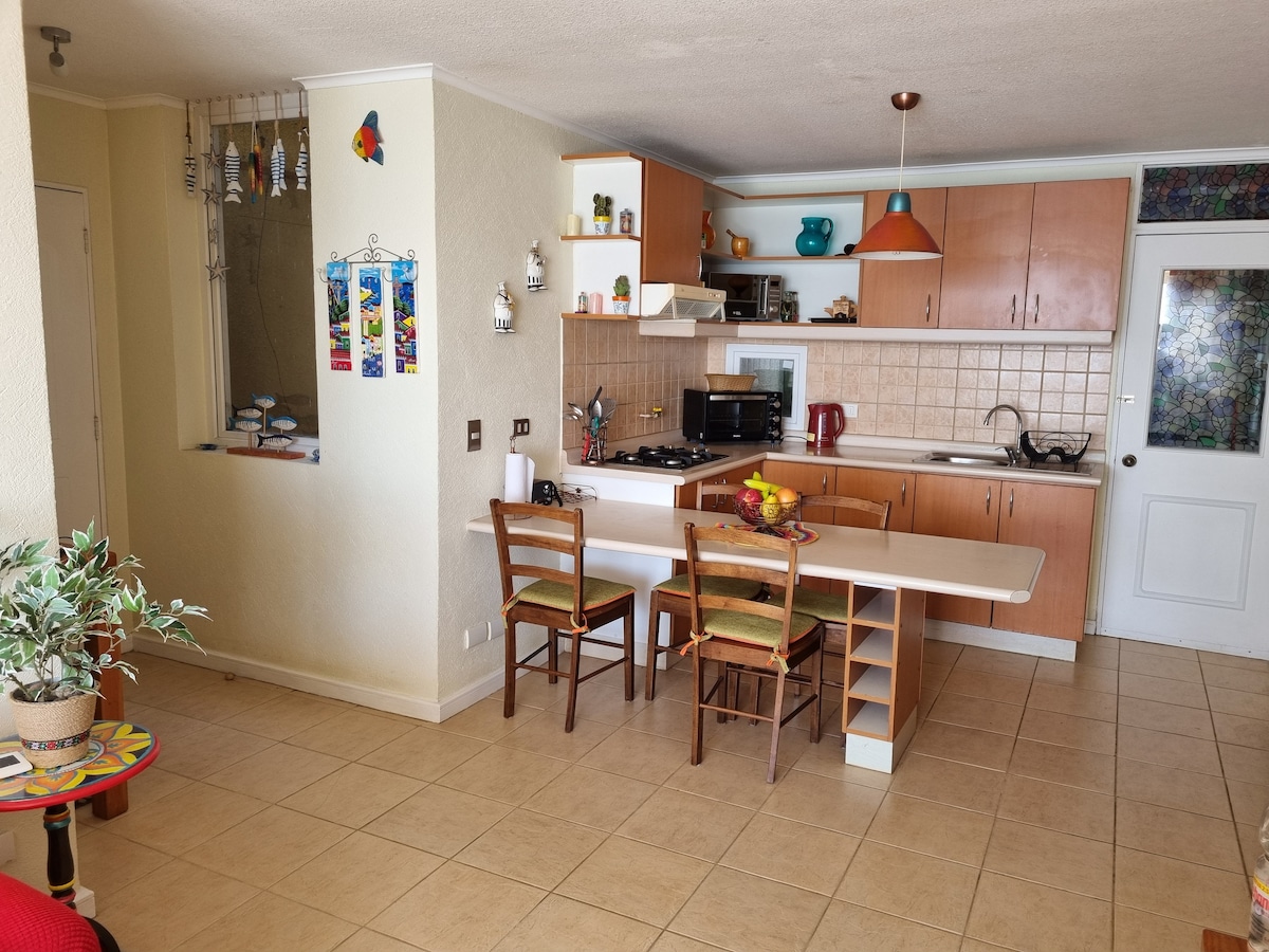 Lindísima, acogedora y amplia cabaña frente al mar en el mejor lugar de Maitencillo (2 horas de Santiago) muy bien equipada, se pueden hospedar hasta 9 personas cómodamente, condominio con piscina, quincho y estacionamiento privado. Terraza con vista al mar, living en terraza y playa en frente sin tener que cruzar una calle! Para disfrutar del mejor atardecer o pisco sour mirando a los niños sin que nadie interrumpa!! Condominio familiar se prohíben las fiestas!! Solo se arrienda por Airbnb.