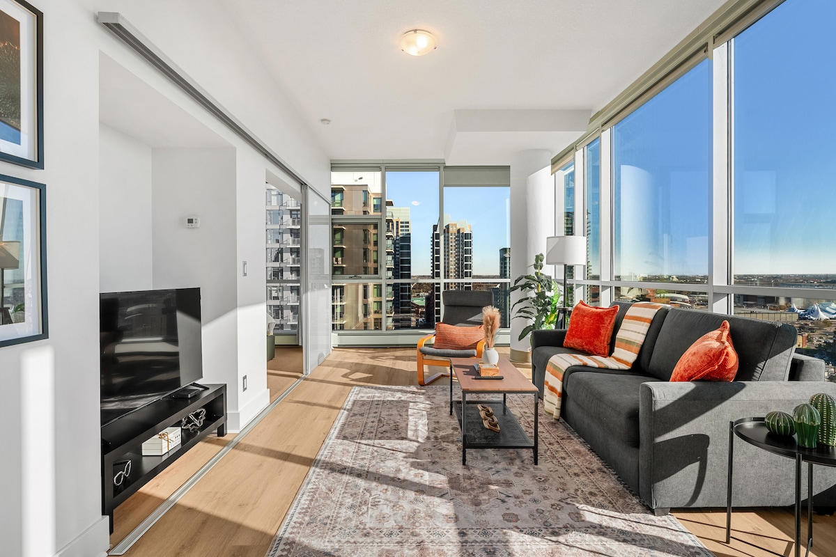 Welcome to our stunning downtown Calgary corner unit condo! This modern retreat offers you the perfect combination of convenience, luxury, and breathtaking views. As you step inside, you'll immediately be captivated by the floor-to-ceiling windows that showcase the stunning city skyline and majestic mountain vistas. Please be aware that the front doors of the building lock at 10 pm. If you book, you'll have to pick up the key/fob in a different location. *** POOL is closed for the winter.