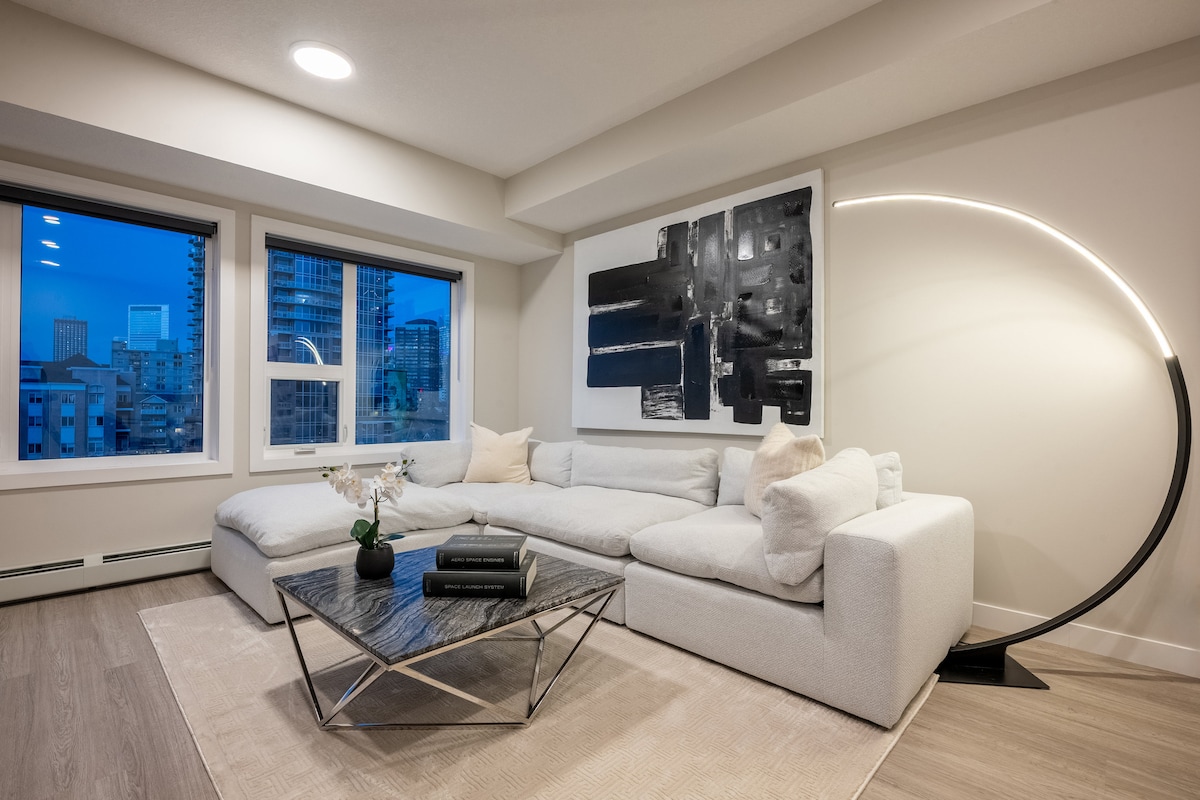 About this space This beautiful 1 bed and 1 den apartment is your home away from home. It offers all the convenience and comfort you need to make your trip memorable and comfortable Modern living space with floor to ceiling window that lets in plentiful and beautiful natural light, and offers amazing views of Downtown Calgary and Rocky Mountains in the distance Unbeatable location offers exceptional convenience to amenities and entertainment experiences. It's close to all public transportations.