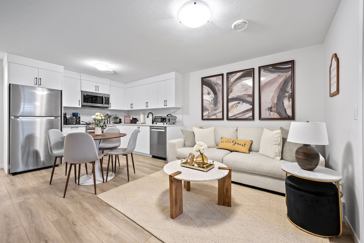 🏔️ Mountain Escape – stylish, modern 1BR condo in Rockland Park. 📍 Location: 1 hr to Banff/Canmore 🍳 Kitchen: stainless steel appliances, fully stocked essentials 📺 Entertainment: 55" 4K TV + PS5 💻 Work: height-adjustable desk & chair 🌐 Wi-Fi: 1 Gbps 🔒 Security: 24/7 self check-in, smart lock, exterior camera 🧺 Laundry: in-suite washer & dryer 🚗 Free Parking 🌿 Outdoor: Patio with picnic table, near walking trail Perfect base for couples or small families—book now to lock in your dates!