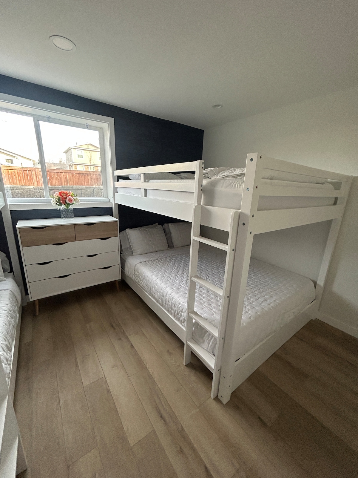This spacious, clean & unique home is located in a quiet neighborhood near Calgary's top destinations. Perfect for short and long term stays. Big spacious bedrooms with a king bed and large TV in the living room are sure to impress. 3 Bedrooms plus a private den with wood-burning fireplace, balcony and pull-out full size bed. 1 king bed, 1 queen bed, 2 twin beds, 1 pull-out double bed, 1 Cot Projector TV with Amazon Firestick ❤️ Don’t forget to hit the “❤️” button so you can find me easily!