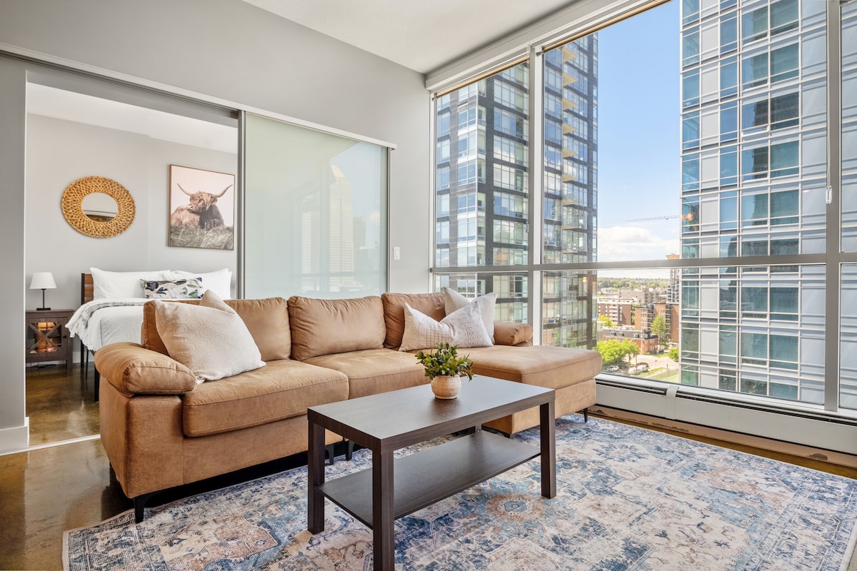 Welcome to our stunning downtown Calgary corner unit condo! This modern retreat offers you the perfect combination of convenience, luxury, and breathtaking views. As you step inside, you'll immediately be captivated by the floor-to-ceiling windows that showcase the stunning city skyline and majestic mountain vistas. Please be aware that the front doors of the building lock at 10 pm. If you book, you'll have to pick up the key/fob in a different location. *** POOL is closed for the winter.