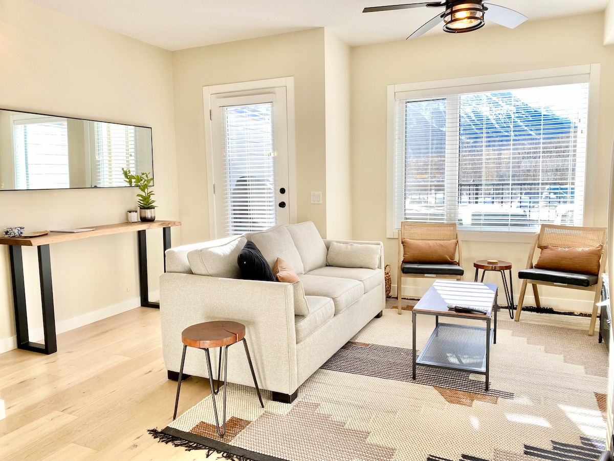 Relax on the private balcony with a cup of coffee as you watch the sunrise over the mountains. And only 1 min away from the Banff National Park gate! This vacation home can accommodate up to 7 adults and 1 kid. - SUPER comfy beds - 100+ TV Channels - In suite Laundry - WIFI - A private balcony with gorgeous mountain views - A gas fireplace - A spacious fully equipped kitchen - Air Conditioners - A huge backyard with BBQ grills(Shared) - Plenty of free onsite parking
