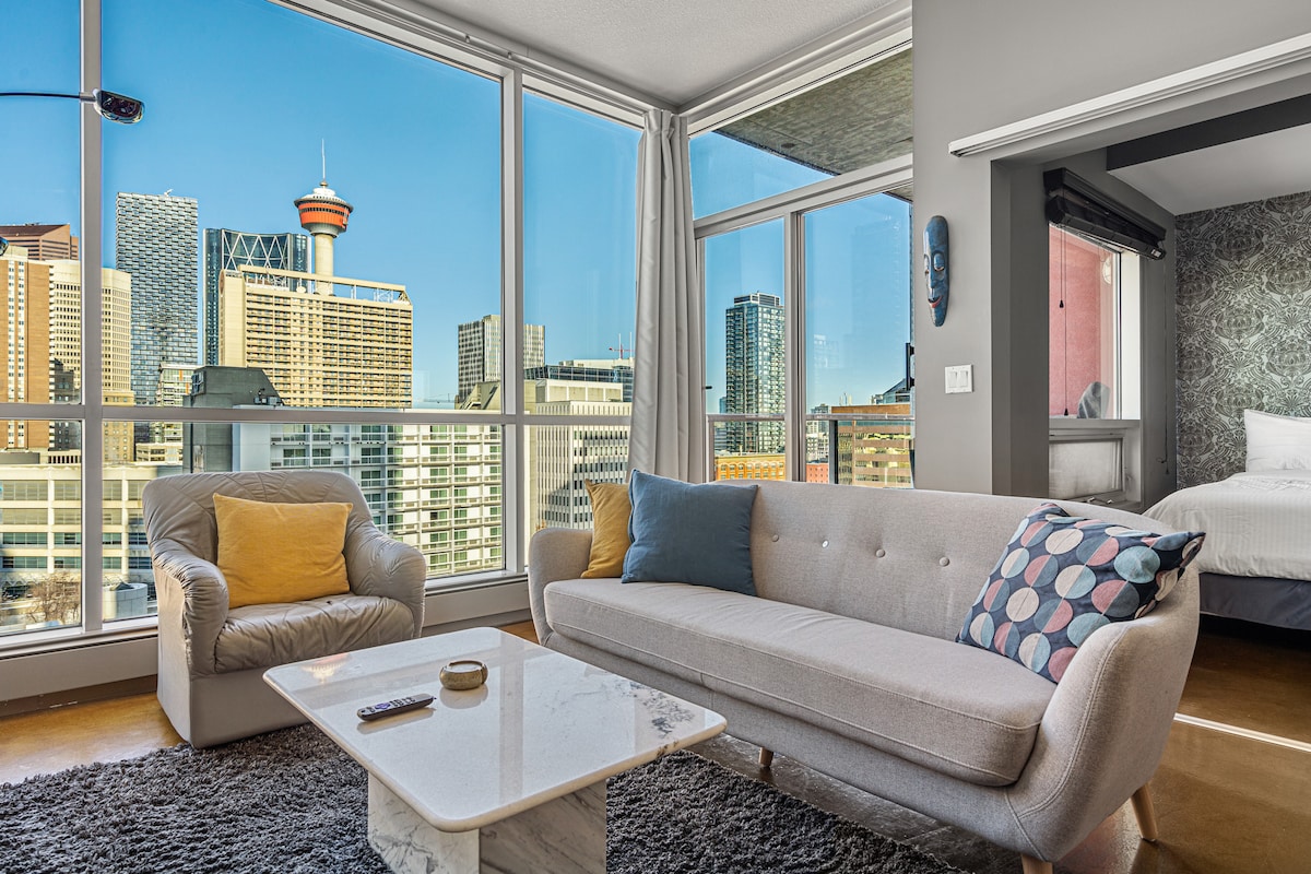 Live life in style at this amazing 2-bed condo with breathtaking downtown skyline views! Enjoy unique features like floor-to-ceiling windows, polished concrete floors, and stylish furnishings. Marvel at sunsets over the Rocky Mountains from your living room! Walk to Calgary's hottest restaurants, nightlife, and events. Located near Proof, Ten Foot Henry, Native Tongues, 17th Ave SW, and the Calgary Saddledome & Stampede Grounds! Don't miss this opportunity to stay at Calgary's finest!
