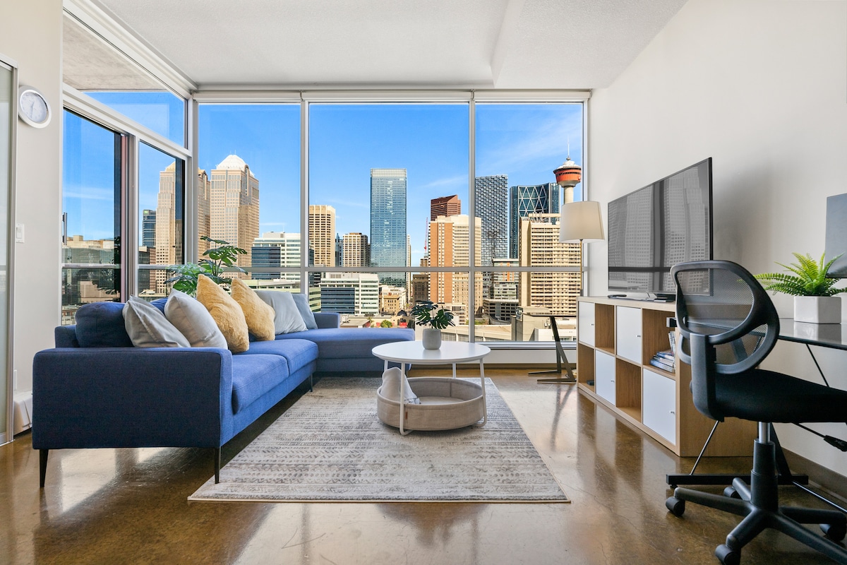Wake up to stunning skyline views in this stylish 2-bed, 1-bath condo nestled in one of Calgary’s most vibrant neighbourhoods. Just steps from the downtown core, 17th Ave, Stampede Grounds, and some of the city’s best restaurants, cafes, and nightlife — you’re truly in the heart of it all. This sleek and modern space features 24/7 check-in, A/C, free underground parking, full stocked kitchen and bathroom. Basically everything you need for luxurious stay, we’ve thought of it.
