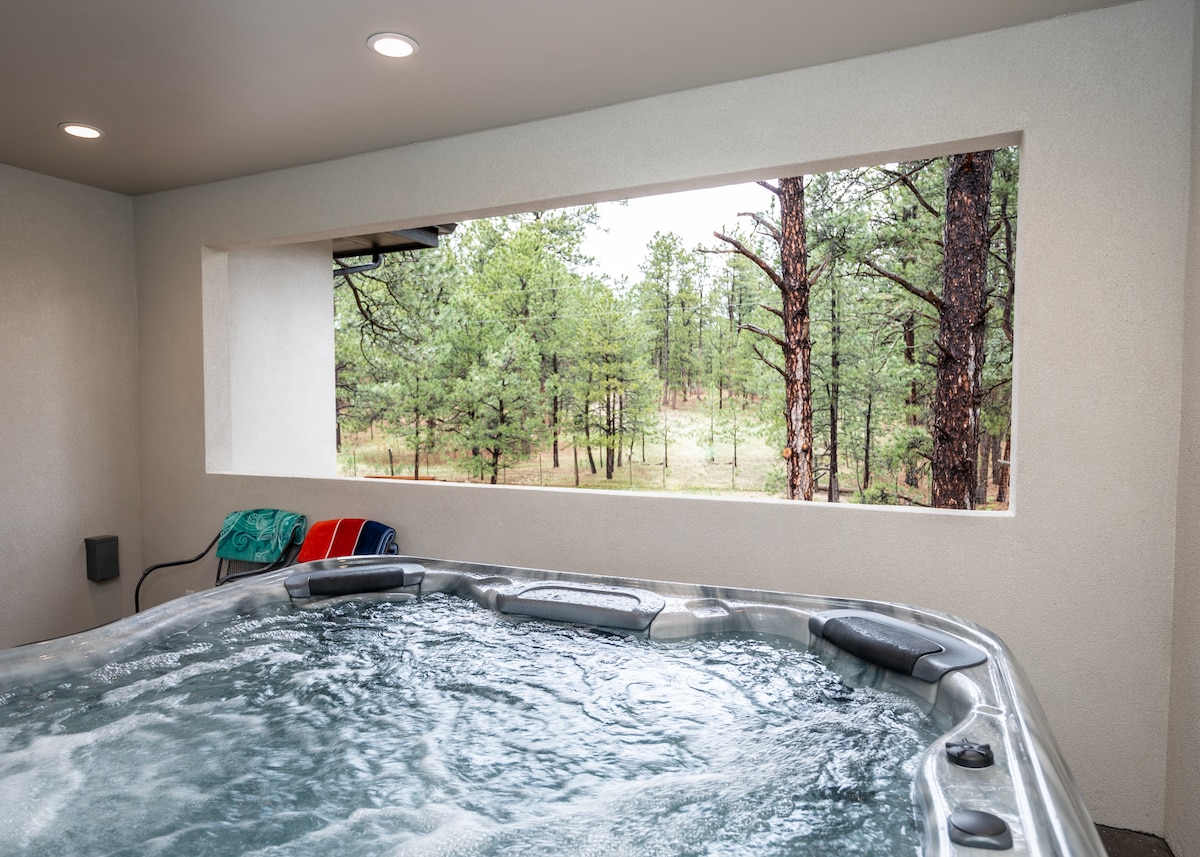 1000 sq ft new house on the edge of Colo Springs. Full Kitchen TV-QLED 55" TV (Rolls to LR, BDRM & spa) 100M fiber Internet Private Spa: Perfect couples retreat Open Air shower 2 pers unique hot-tub/bathtub. 1. Fill to any temp (110F max) 2. temp +/- on the fly 3. Bathe 4. Drain - No Chems Shares 10 quiet acres with 1. 2nd 2-person Airbnb 2. Main House - (Judy & I) Buildings are separated-Lodge is private Trails (on property & state trail close by)