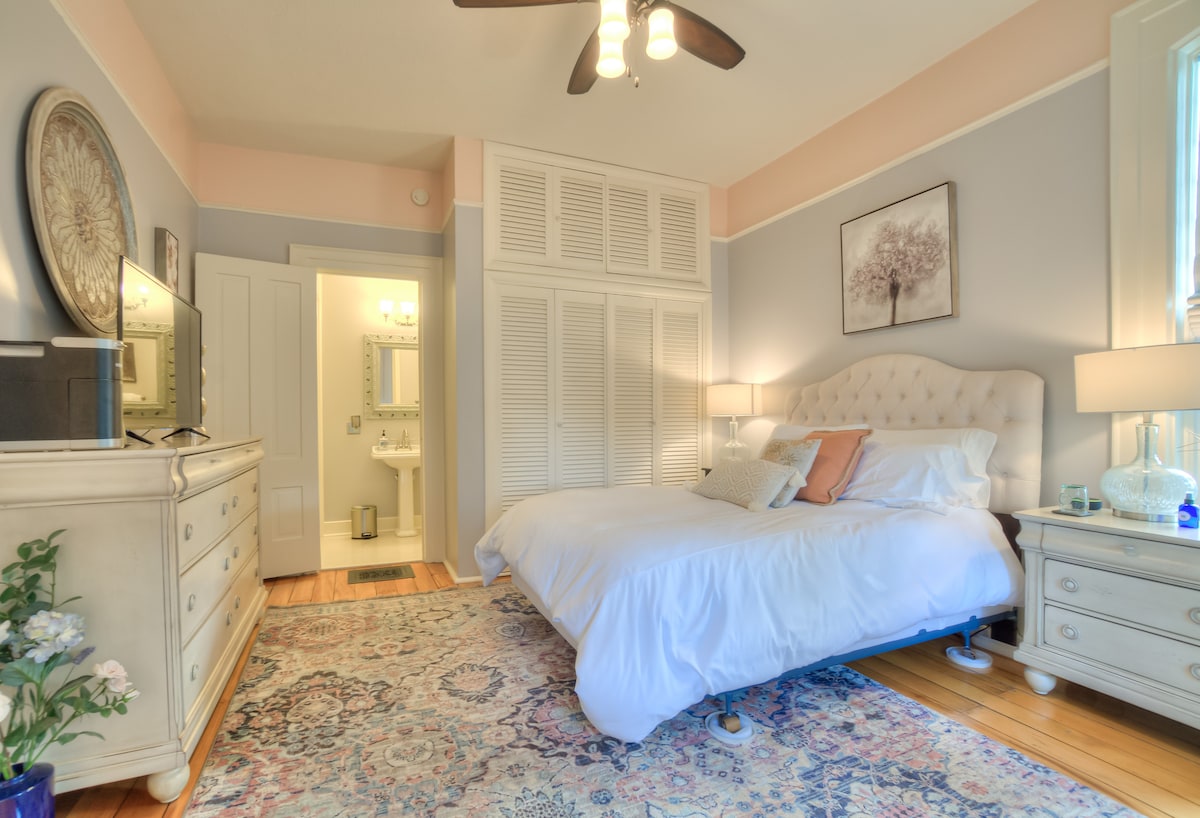 Beautiful bright and cozy hotel room located on the second floor of the Villa on Verona. The 1860's Italianate Victorian has been newly decorated and furnished. This room features views of the East lawn and Tennis Court. Queen Bed with European goose down comforter, Smart TV, full length mirror, window shades and private bath. All amenities are available to guests including pool, hot tub, pickleball court, lounge space in the basement and main floor common areas.