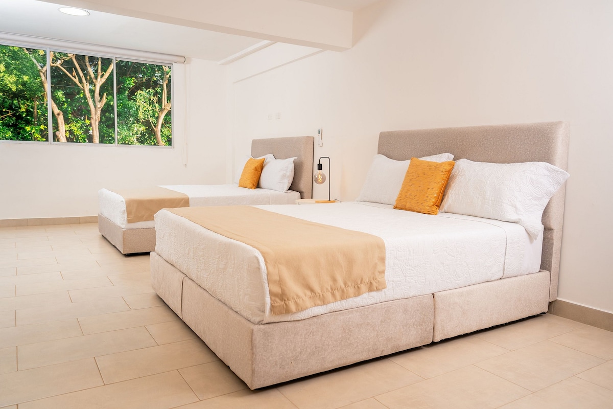 Habitación cuádruple, equipada con dos(2)camas tamaño matrimonial(Queen)(1,90 metros de largo x 1,40 metros de ancho).Hay aire acondicionado portátil, ventilador, Tv 32",mesa de noche, lampara de mesa, espejo de medio cuerpo, closet de pared a pared. Hay servicio gratuito de wifi de banda ancha ,tv cable, canales streaming (netflix-HBO-MAX), muy iluminada y ventilada. Baño exterior compartido.