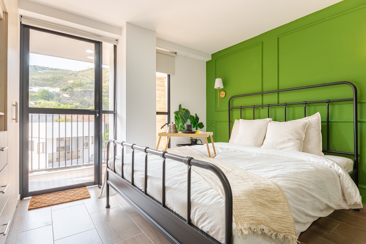 Spectacular apartment in one of the best neighborhoods in Cali with a panoramic view of Cristo Rey, very bright - Free luggage storage service Very comfortable room with a queen bed, a spacious balcony with an living room, a work space, a full kitchen, and a dining bar. The building has a coworking area, jacuzzis, a BBQ terrace, and an outdoor bar. Close to shopping centers, clinics, a dog park, the Granada neighborhood, El Peñón, and the Pascual Guerrero stadium, El perro park and much more!