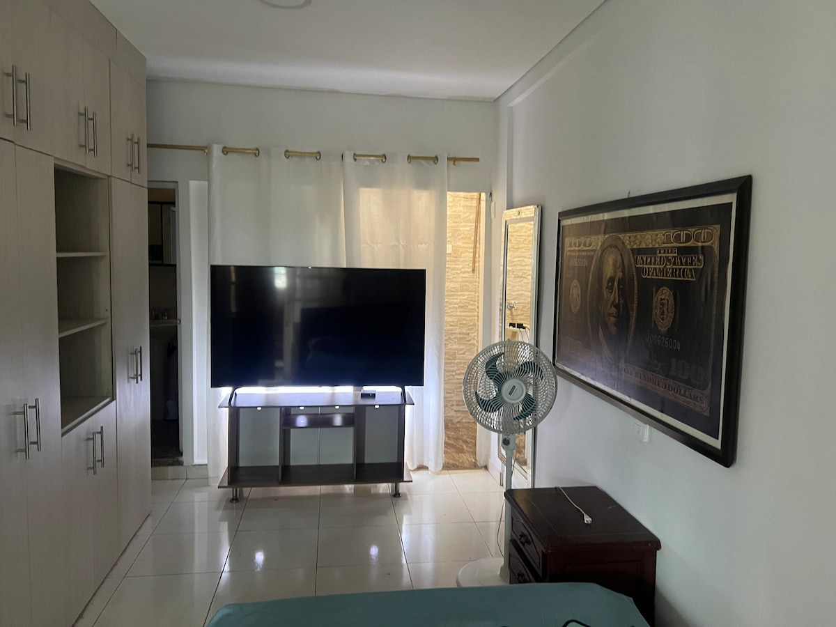 Enjoy the city in this centrally located accommodation. Close to main avenues and shopping centers, Smartfit Gym two blocks away, supermarket, restaurants, a bakery on the corner, Enjoy a cool and very welcoming space. Ideal for a weekend getaway, a business trip, or a full month to be close to the festivities during the Cali Fair. We also offer Wi-Fi, a washing machine, (no additional payment) a Smart TV with Netflix already installed, a fully equipped kitchen, refrigerator, and a fan.