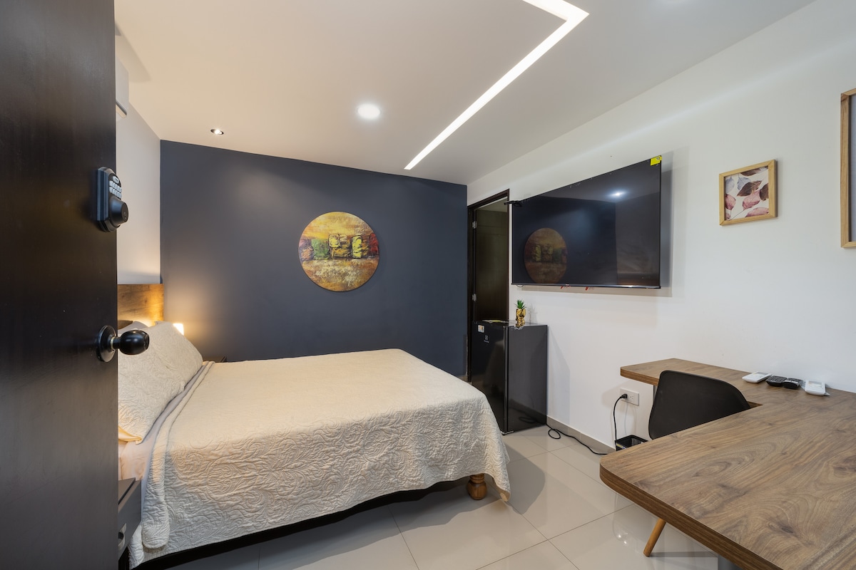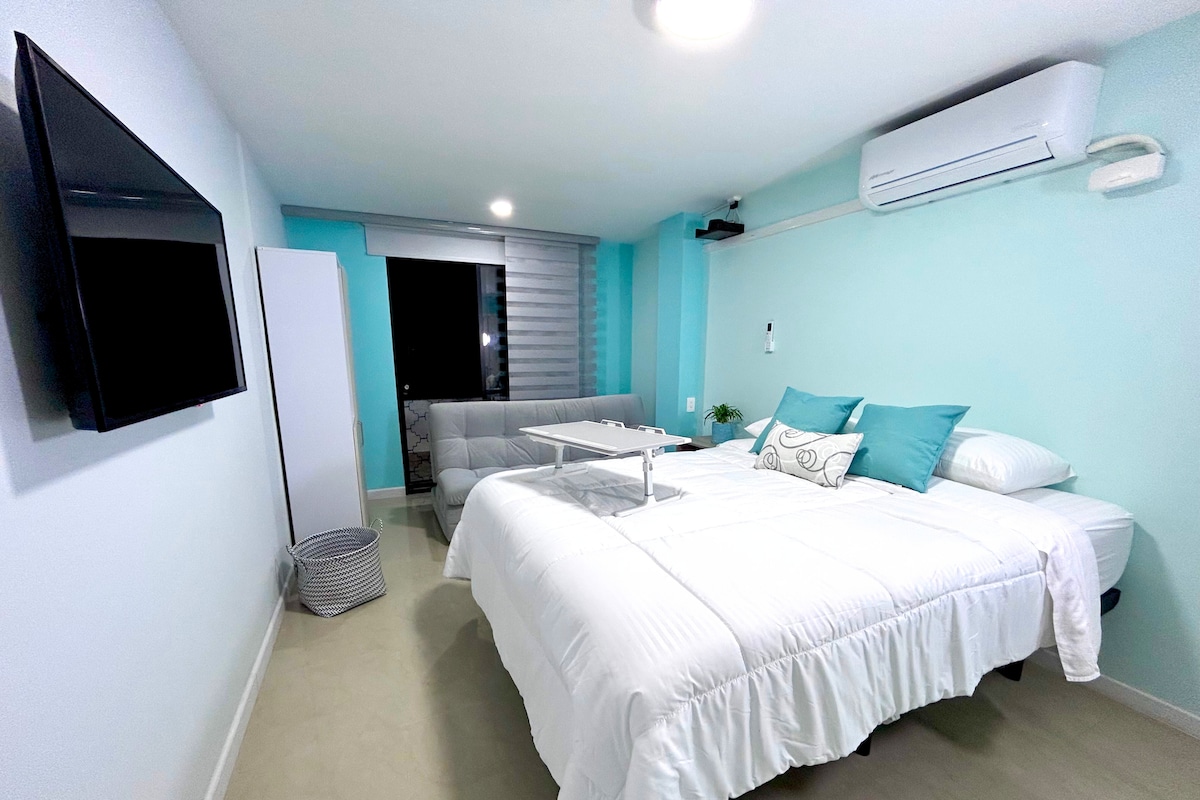Enjoy this spacious 2-bedroom penthouse. 100Mbs WiFi, smart TV, A/C, hot water, and a fully equipped kitchen keep you comfortable. Ideal for family, executives and patients of medical treatments. Three queen beds with hotel-grade linens Washer Street parking Walk to cafés, restaurants, groceries store and El Ingenio park; 7 min to Unicentro Mall and 10 min to Jardin Plaza Mall. 30 min to downtown. Very close to universities, Club Campestre and Clínica Valle de Lili. 60 min to the airport.