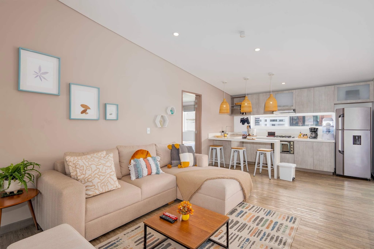 🌴 EXSTR APARTMENT • Brisas del Peñón 401 Stylish 2 bedroom, 2 bathroom penthouse with beautiful views of Cali’s iconic Three Crosses. Enjoy fast 300 Mb Wi-Fi, two workstations (one with electric desk + monitor), SmartTVs, A/C in bedrooms, and noise-reducing windows in the master bedroom. The private terrace features outdoor dining, a BBQ, and a small kitchen — perfect for soaking in Cali’s warm evenings. Located on quiet tree-lined street, steps from Krost bakery and all the best of El Peñon.