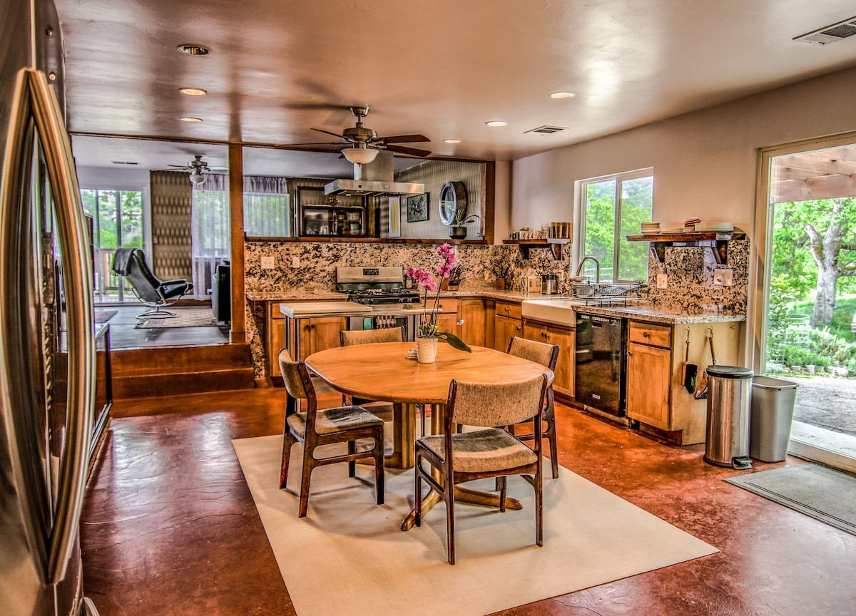 Modern Sequoia Retreat with Pool & Deck Escape to 1.5 acres of privacy with stunning High Sierra views. Step inside this stylish home featuring Mid-Century Modern furniture, custom redwood finishes, and a claw-foot tub. Cook in fully equipped kitchen or grill outdoors, enjoy comfortable beds, and unwind in total comfort. Free Extras: Outdoor pool; EV Charging (Level 2, 50A); 300 sq. ft. Office Space (available with 24+ hrs notice); Wi-Fi & streaming TV (Amazon Prime, ESPN, Nick Jr. etc.)