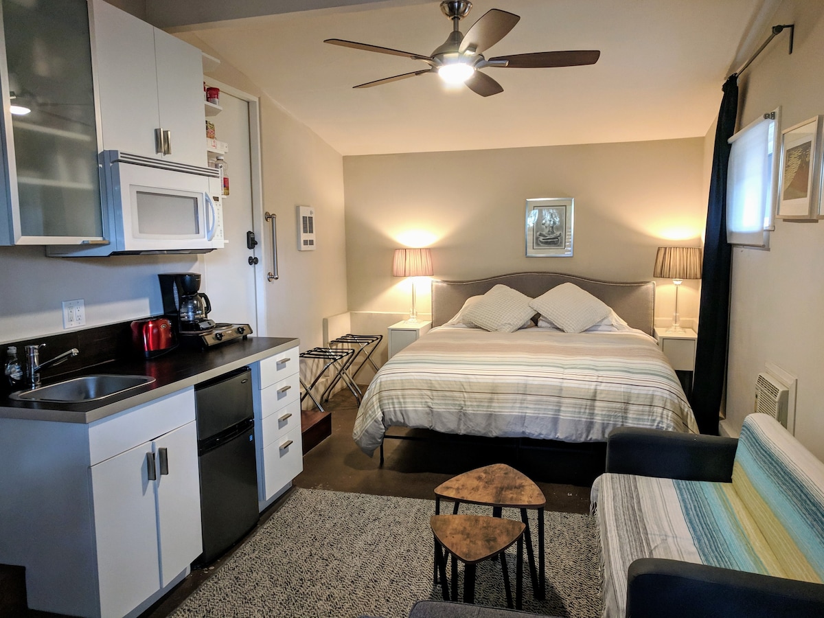 安静的单间公寓:加大双人床、空调、洗衣机