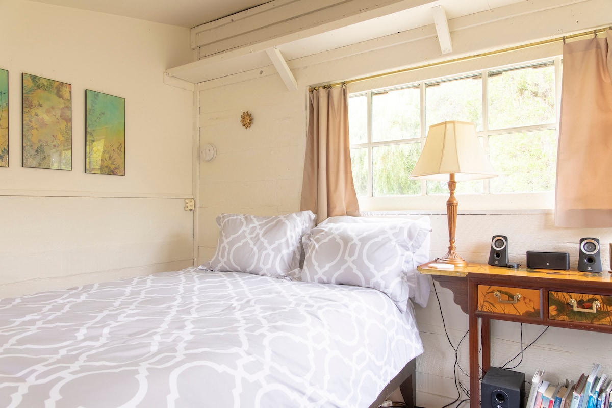 This cozy bungalow (225 sq.ft.) is situated on 6 acres of redwood forest within walking distance to the coastal village of Trinidad and 30 minutes drive to the tallest trees in the world, amazing hiking trails and the rugged beaches of the Northern California coast. Immerse yourself in the glories of the redwood forest around an evening fire under the stars. The Bungalow is private, freshly remodeled, clean and comfortable with beautiful afternoon light, shaded in the morning for sleeping in.