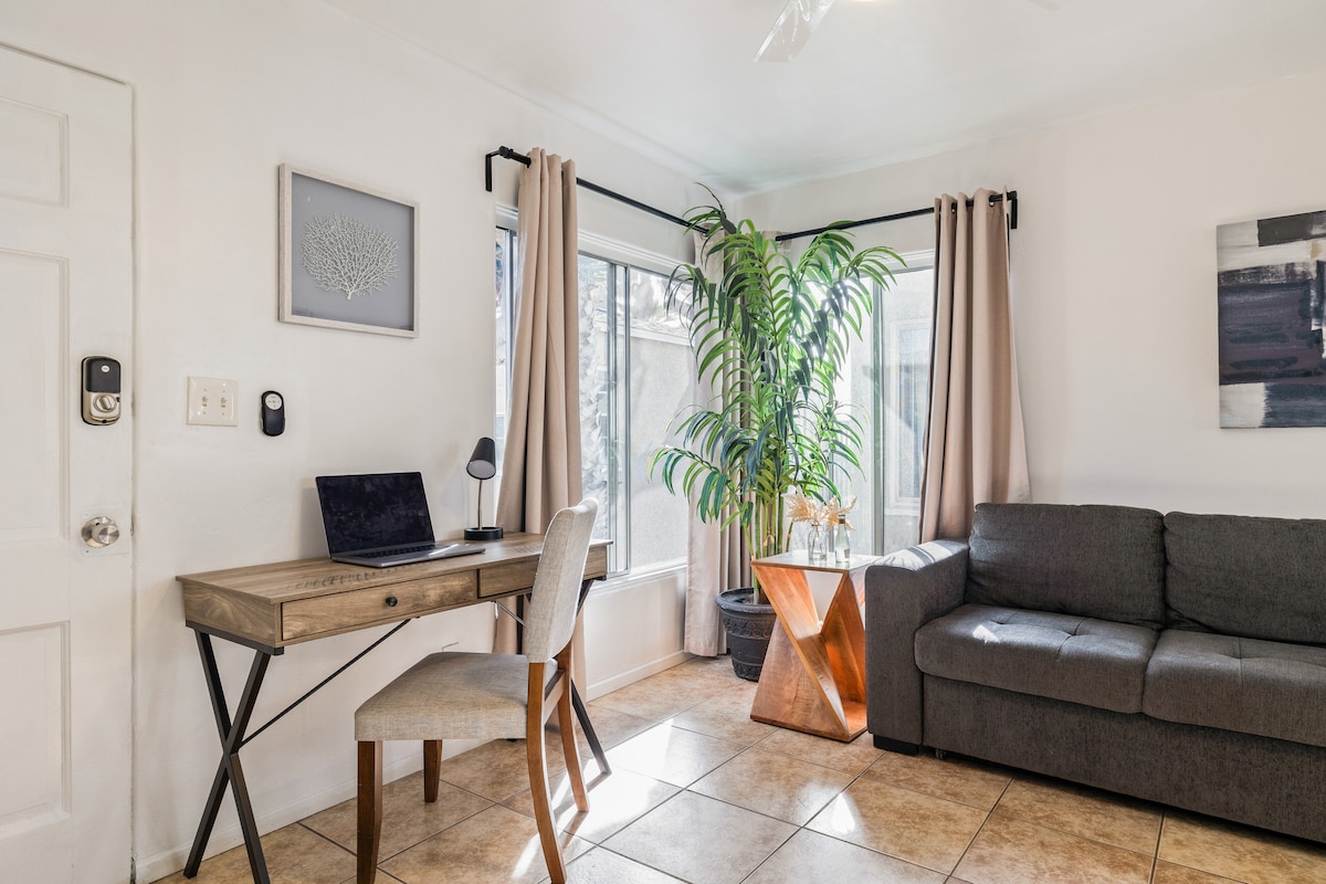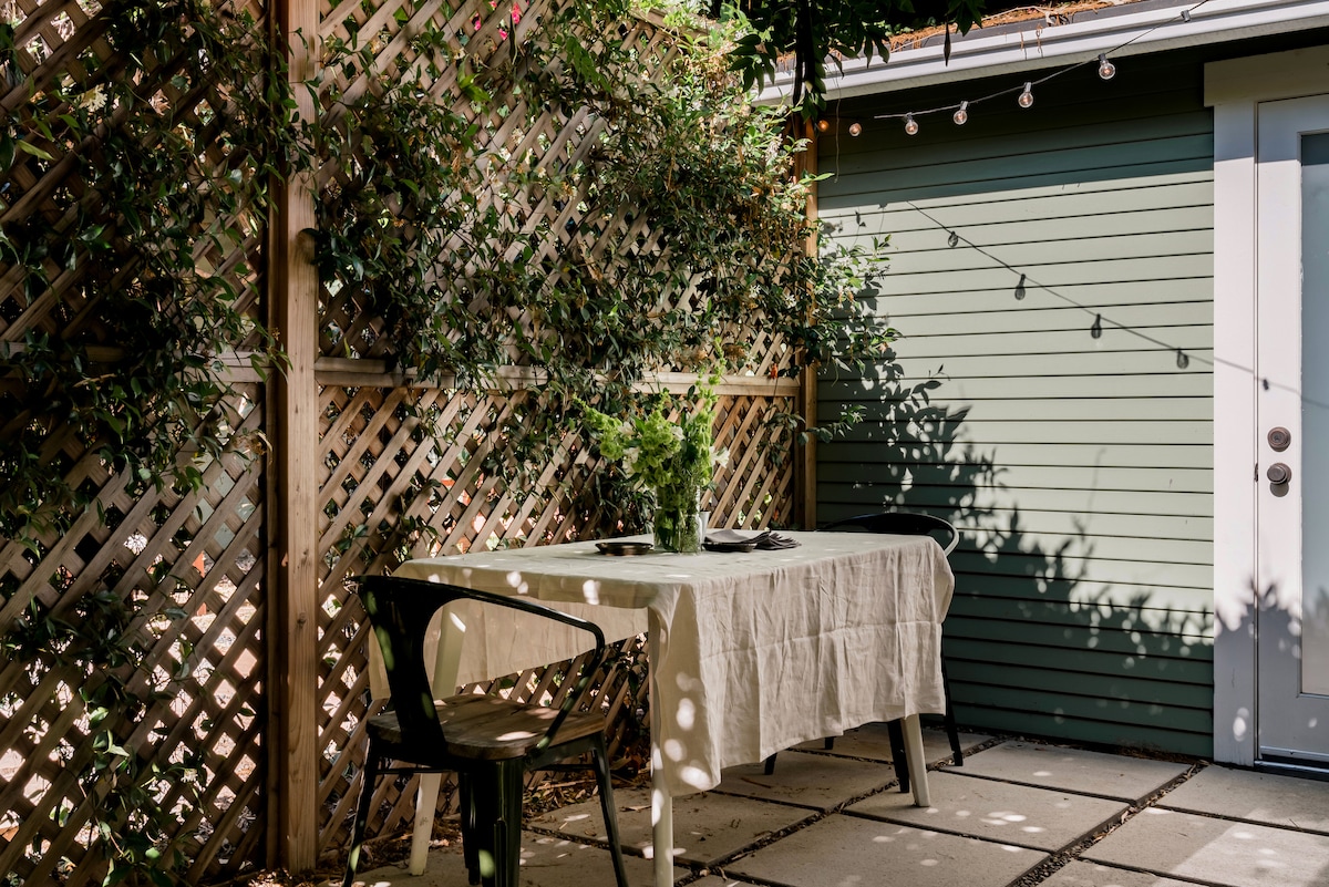 Step through the carriage doors and into an open interior with polished concrete floors, plus a kitchen with navy cabinets and stone countertops. The bedroom comes with barn door, bamboo floors, and 55" HDTV, while a verdant garden awaits outside. Enter the guest house thru carriage doors to a first floor open living space with kitchen, sofa and 60'' HD flatscreen TV. Polished concrete floors and stone countertops. Exit to open, outdoor staircase leading to an upper bedroom with Cal-King Bed, bamboo floors, dresser, 55'' HD TV, comfortable bathroom with walk-in shower and vanity. Wifi / Cable / AC & Heating units in each room. Design is a mix of beach cottage with contemporary accents. 2 Blocks to beautiful Ocean Avenue to watch gorgeous California sunsets or walk to beach. 2 Blocks to Montana Avenue shopping and cafes. Close to Promenade and Metrolink. Unbeatable Location ! Our place is good for couples, solo adventurers, and business travelers. The bungalow is a separate guesthouse but owners are present on the property in the main house. Outside table with a bench and chairs are perfectly located for morning coffee lunch or evening cocktail. We live in the front house so feel free to reach out to us with any questions and/or concerns regarding your stay. Leave the car behind - the beach, restaurants, cafes, and shops, are all an easy walk away. Rent a bike nearby to explore further. Watch the sunset over the water from Ocean Avenue, 2 blocks away, while Metrolink and Promenade are also close. Rent a Hulu Bike for your stay. “On May 12, 2015, the Santa Monica City Council adopted the Home-Sharing Ordinance reiterating its ban on the rental of entire units as vacation rentals. The Home-Sharing Ordinance also legalized the short term rental of a portion of a person’s home when the host lives on-site throughout the visitor’s stay and when the host obtains a business license. Hosts are also required to collect and remit Transient Occupancy Tax (TOT) if not collected and remitted by the hosting platform.” Our license #221557 is listed with the City of Santa Monica