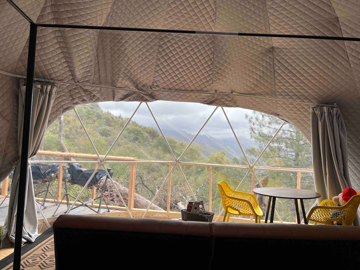 Glamp in style just 15 mins from Kings Canyon & Sequoia! Our cozy geodesic domes sit on 40 acres and include AC, WiFi, a smart TV, and a huge window with a beautiful view. Enjoy a private outdoor deck, access to a modern private bathroom (100 ft away), and a community outdoor kitchen with a grill. The dome offers sweeping views of the valley and surrounding mountains. Peaceful, unique, and perfect for couples or solo adventurers. During the winter, stay nice and warm with a pellet stove.