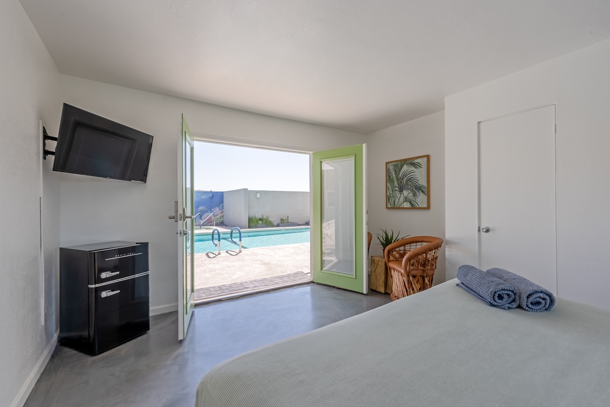 The Desert Rambler Suite is #1 and is the largest of our 5 rooms at Spin & Margie's Desert Hideaway, a quiet oasis retreat on 29 Palms Highway, less than 5 minutes from the center of Joshua Tree. This spacious suite has a queen bed, complete kitchen with oven and large fridge, and a small second room with a double bed. Situated on 2+ acre private grounds with a beautiful pool. Peaceful, secluded, yet close to Joshua Tree, 29 Palms Highway, the National Park, and other local attractions.