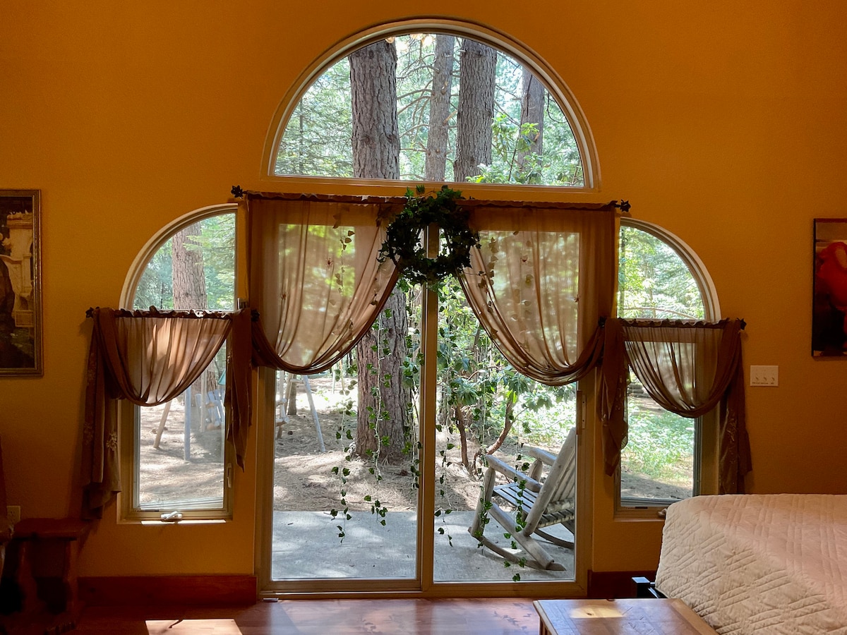 If you are looking for a peaceful and tranquil escape, you are looking at the right spot. Nestled beneath whispering conifers and oaks, this cabin boasts of beautiful mountain and valley views. Trails for hiking and premier mountain biking in the Tahoe National Forest; simply open your door and begin your adventure. Short drive to Nevada City and Yuba River; 45 minutes to ski slopes in the Sierras. The custom 600 sq. ft. private studio with a gas fireplace is fully equipped for up to 4 guests.
