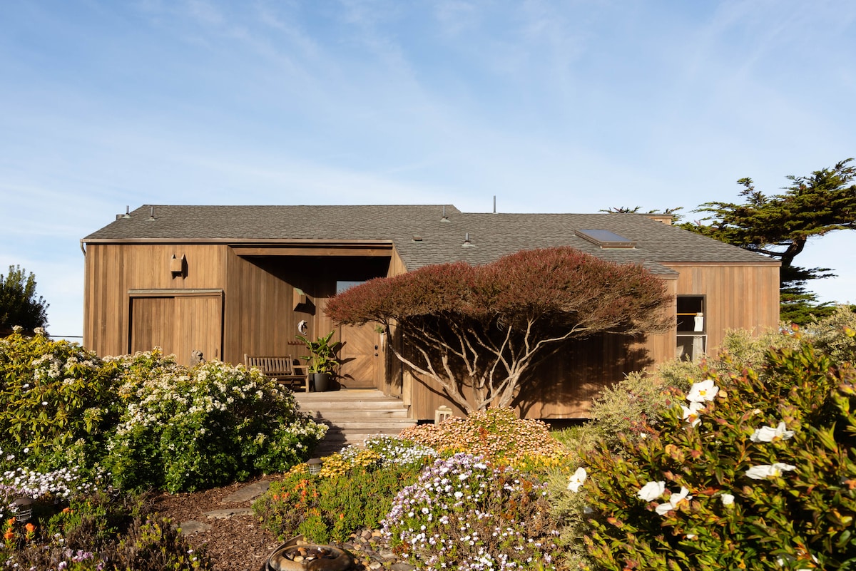 Located steps from premier sand beach, Walk on Beach. Entering the gates, you'll be greeted by a tranquil, mature garden blocked from the wind, a deck, and a hot tub. Inside this solar powered 1970s modern vernacular contemporary home, you'll find a cozy raised living room positioned for maximum views. Bedrooms are on the ground floor, along with bathrooms, living, dining, fully-equipped kitchen, and laundry. A study is upstairs. 1% of proceeds go to airbnb.org