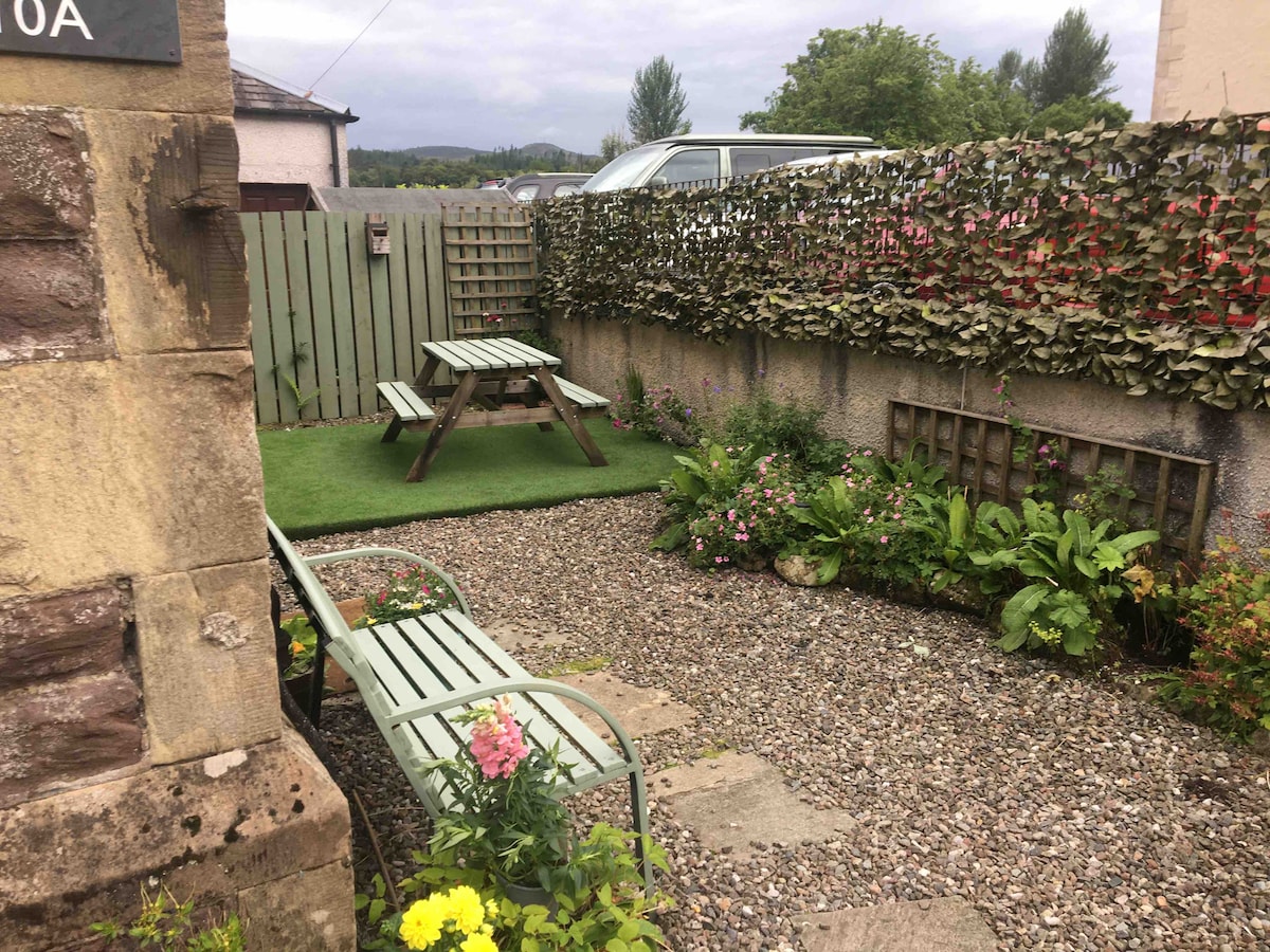 New carpets, sofas and bed. The one bedroom flat has a Fenced garden.with seating. free parking. New integrated kitchen 2020.. New bathroom 2021.. photos to follow. Shops, restaurants and walks on your door step. Central for visiting the National park, Glasgow, and Edinburgh.