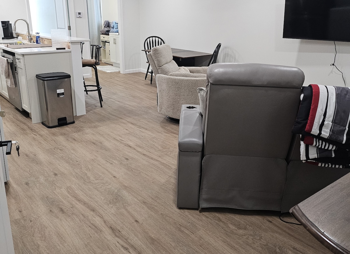 This spacious basement apartment has a keyless private entrance without steps. The space is perfect for two but can easily accommodates three with the comfy queen bed and additional sleeper sofa. You can relax in the leather recliners in front of the oversized flat screen tv, enjoy a game of pool, and cook your own meals in the kitchen. The house has a country feel and is located less than 2 miles from the historic downtown Brick District, city parks, Stinson Creek Trail, and both colleges.